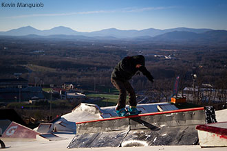 | A snowboarder switches up on one of LMSC’s rail features. |
