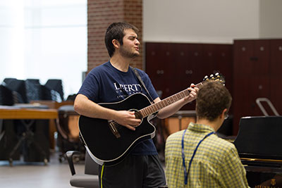 | A Liberty student practices guitar with a camp participant on piano during this week’s Music and Worship Camp. (Photo by Jessie Rogers) |