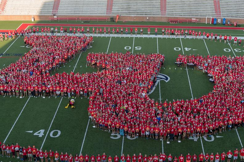 After the event, the freshman class joined the marching band (both were clad in red) on the field, forming a giant “LU” for a photo.