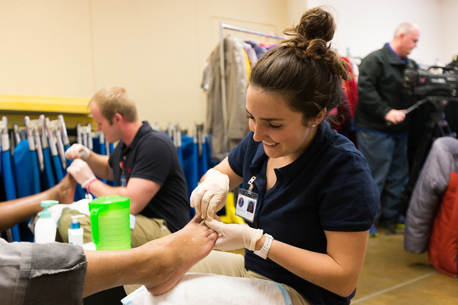 Nursing students serve those in need by washing hands and feet at Salvation Army shelter