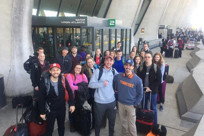 On Thursday morning, students checked in at a parking lot on East Campus for a send-off event, where they were greeted with Chick-Fil-A breakfast. Staff members made sure all the passports and travel documents were in order before students loaded onto five buses where leaders prayed with their groups before heading to the airports.
