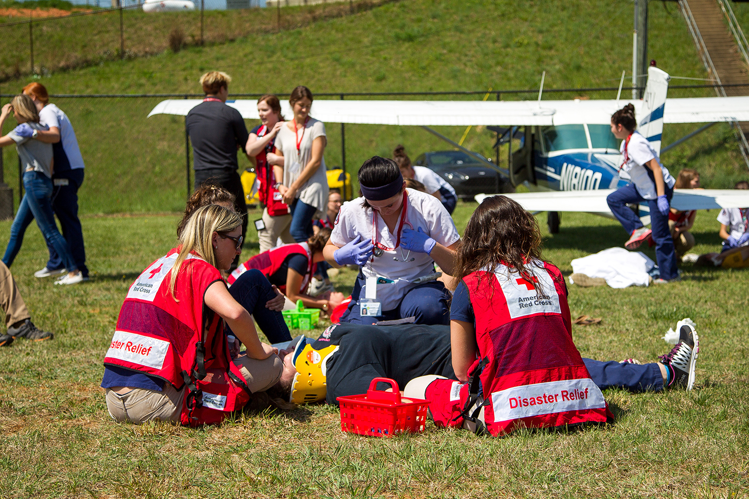 A siren blared at Lynchburg Regional Airport late Thursday morning, prompting a group of Liberty University School of Nursing students to rush across a field just off the tarmac and assess the condition of about a dozen students acting as victims of a simulated plane crash.