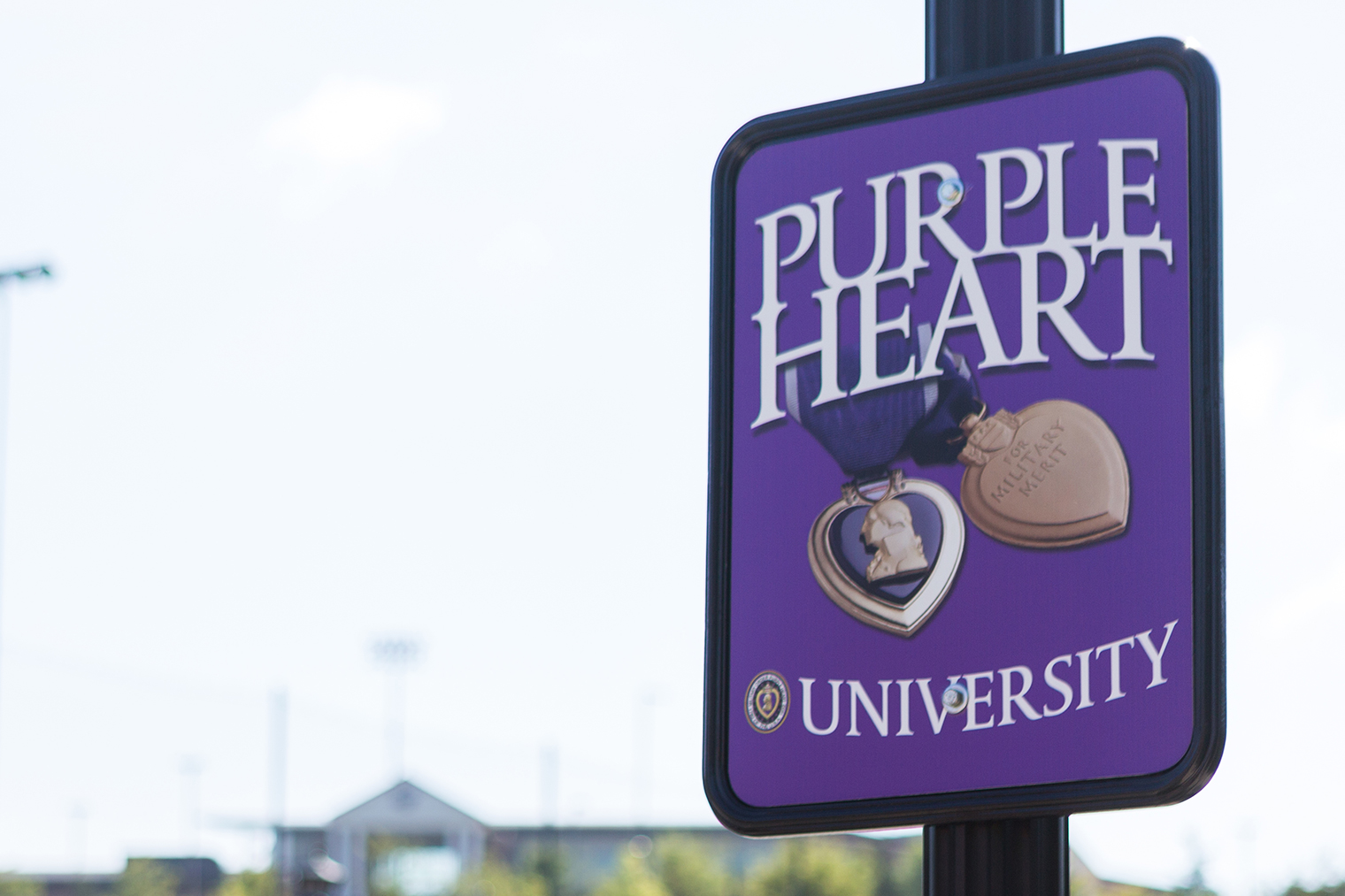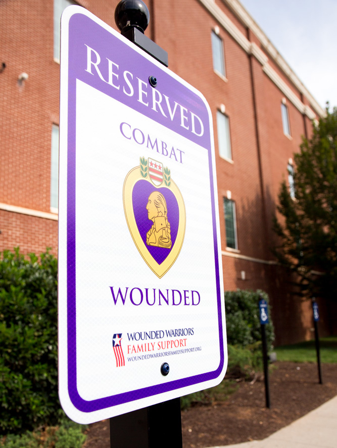 In addition to installing “Purple Heart University” signs at the entrances to campus, the university has also reserved a parking space near DeMoss Hall for Purple Heart recipients and all others who have been wounded during combat while serving in the U.S. armed forces. The space is conveniently located for student veterans visiting the university’s Veterans Center in the Montview Student Union.