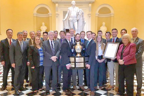 A large, gleaming silver trophy captured the attention of Virginia’s legislators on Tuesday as Liberty University was recognized at the Virginia General Assembly for becoming the first Virginia institution since 1932 to win the prestigious Loening Trophy, presented to the outstanding overall collegiate aviation program.