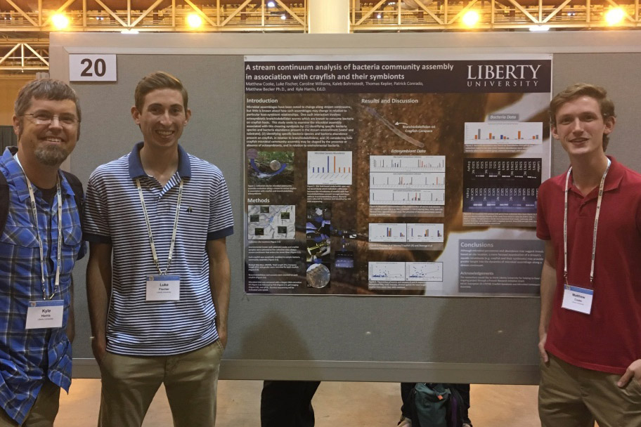 Dr. Kyle Harris, Liberty’s director of organismal and environmental biology, joined four of his undergraduate students — Matthew Cooke, Luke Fischer, Alexandra Reddy, and Caroline Williams. One study that was presented focuses on the symbiotic relationship between crayfish and branchiobdellidans, or worms that live on the body surface of their host. (That research study, supervised by Harris, is now in its third year.)