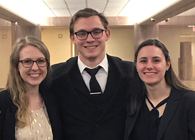 In Washington, the team of third-year law students Sarah Anne Barton, Annie Compitello, and Richard Wiley posted wins over two William & Mary teams, Washington & Lee, Nova Southeastern, and Detroit Mercy to claim the regional title and secure a spot as one of the top 24 teams in the nation. They argued a constitutional law issue that questioned whether a state prison’s policies on solitary confinement violated the Eighth Amendment prohibition against the use of cruel and unusual punishment. Wiley was named the region’s sixth Best Oralist, and AJ Colkitt, from another Liberty team, was the fifth Best Oralist in the region.