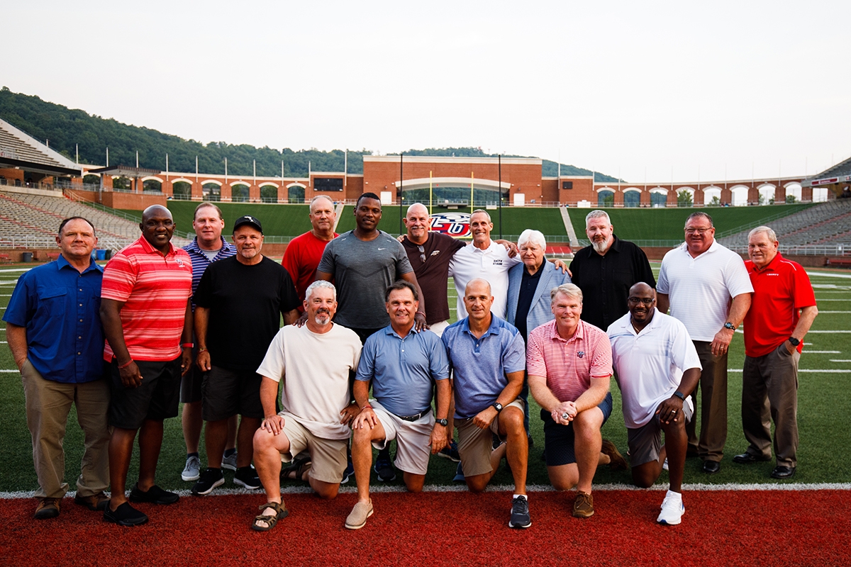 The gathering, which began with a meal and concluded with a speech from Smith and a time of prayer, was held in conjunction with a three-day golf tournament fundraiser sponsored by the high school, with all proceeds going toward Smith’s medical expenses. Many of the former Liberty players live out of state and flew in for the event. Former Flames football coaching staff members Morgan Hout, Bill Gillespie, and Dave Williams were also in attendance.