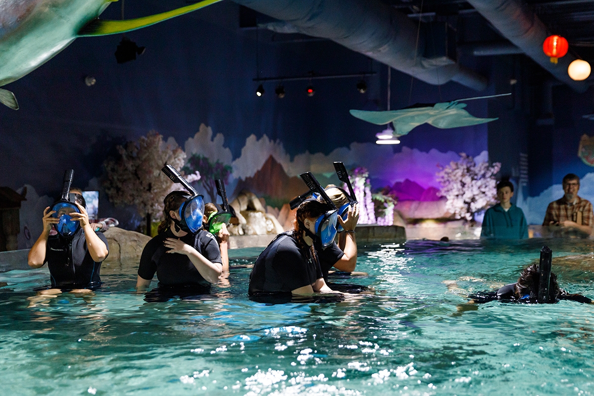 This past week, students donned wetsuits and snorkeling masks to swim in a tank with rays, small sharks, and other marine life. Throughout the rest of the semester, students will be able to interact with other animals at SeaQuest like entering a bird enclosure and bringing a sloth and wallaby into the classroom, and more.