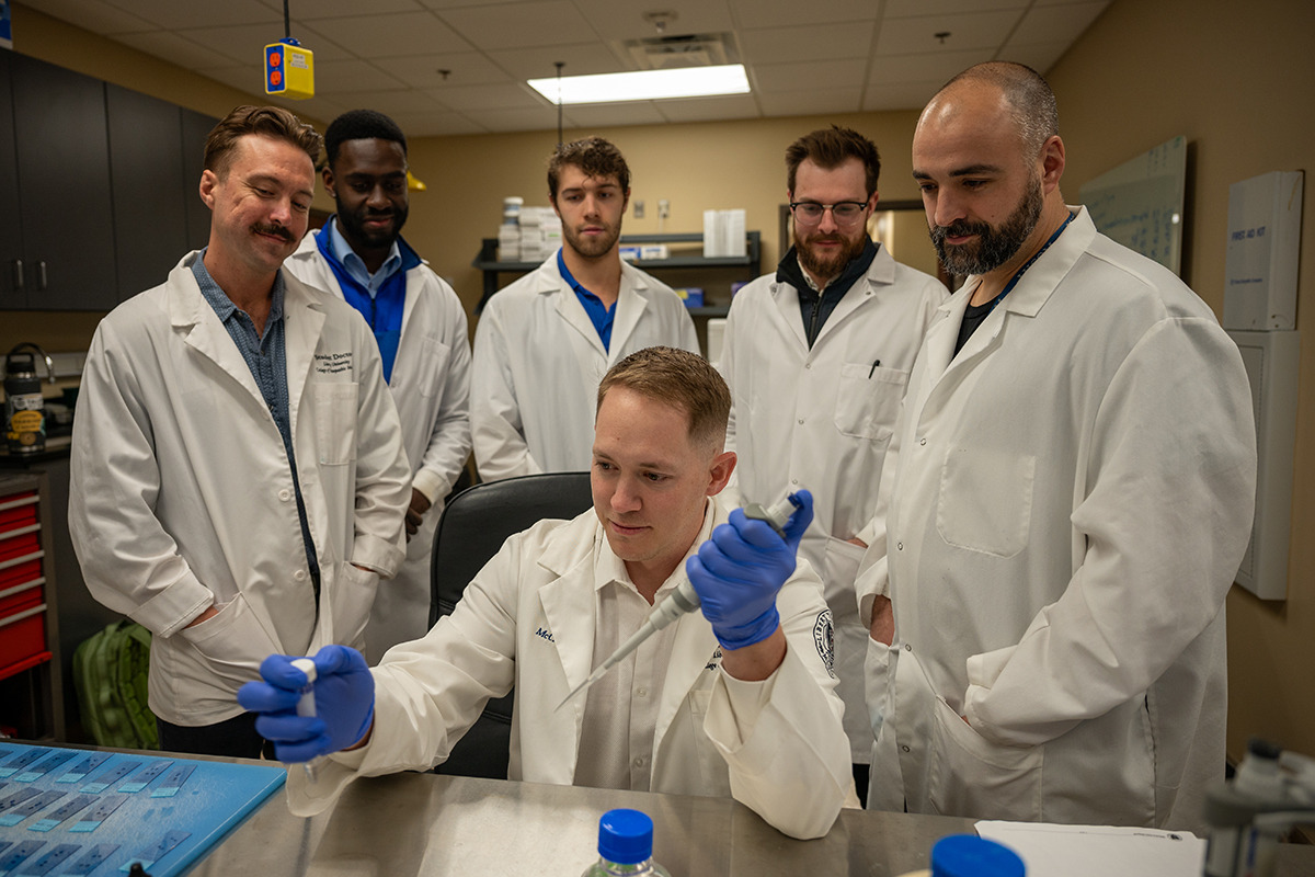 Dr. Joseph Gigliotti (right) with research students in a lab at the Center for Medical and Health Sciences, home to the Liberty University College of Osteopathic Medicine. (Photo by Taylor Blue)