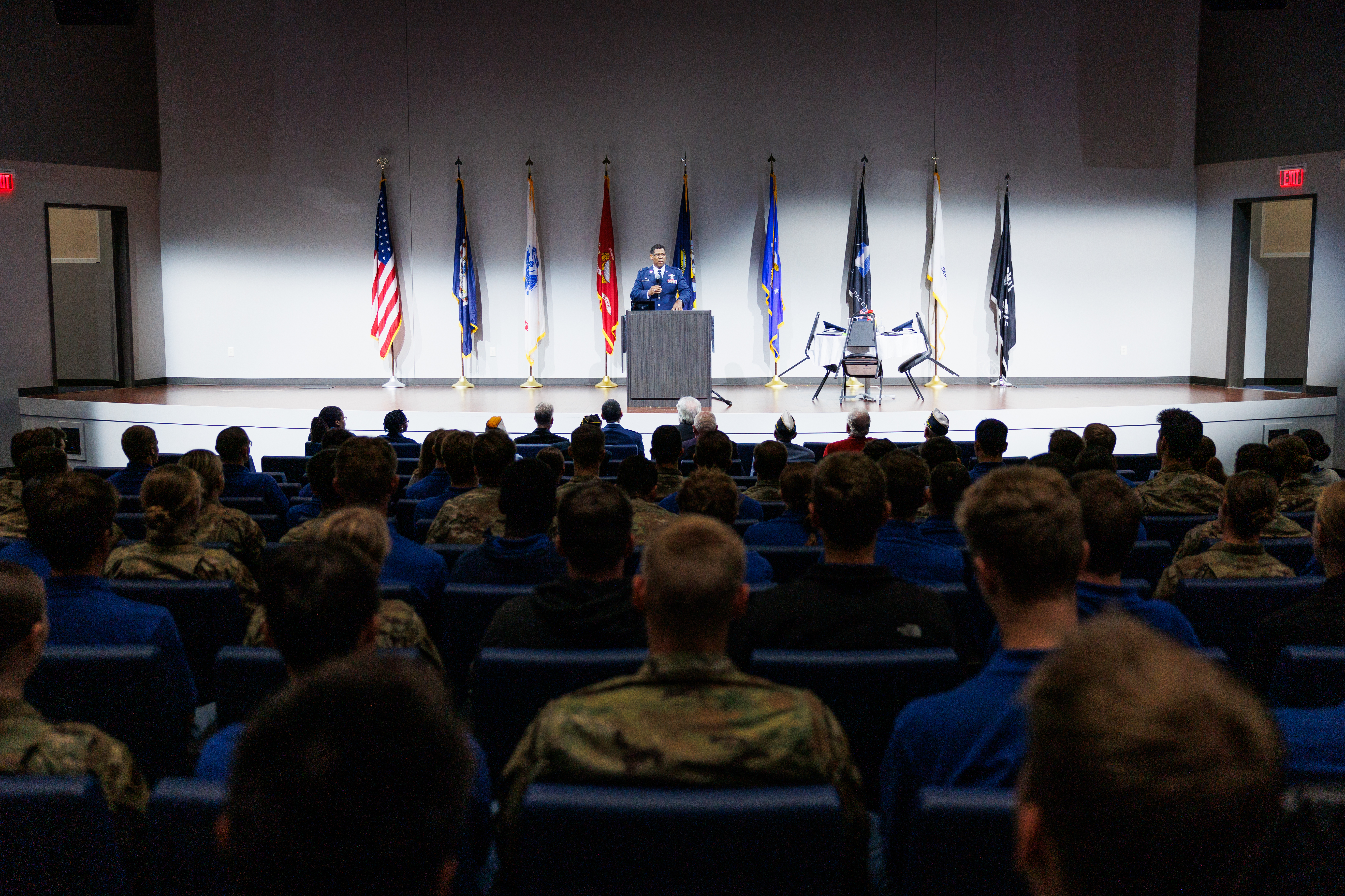 The ceremony, hosted by Liberty’s Air Force ROTC in the Towns Auditorium at the School of Business on Thursday, also included a brief invocation by Jones’ wife, Lt. Col. (Ret.) Martha Stevenson-Jones, and a time of remembrance for those who never made it home. A table was set up on stage adorned with various items to signify the ultimate sacrifice given by American service members.