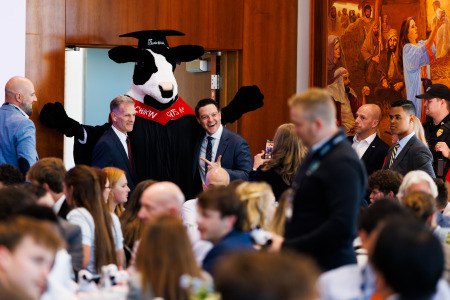 The event concluded with appearances by Liberty President Dondi E. Costin and the Chick-fil-A Cow. Costin organized the recording of a brief video with all those in attendance to thank Cathy for his video message.