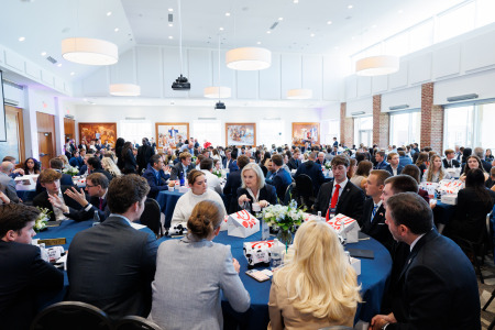 Welcomed with boxes of Chick-fil-A sandwiches, nuggets, gift cards, and more, guests heard a special recorded video message from Chick-fil-A Chairman Dan Cathy welcoming them to the Liberty University Future CEO Luncheon on Wednesday.