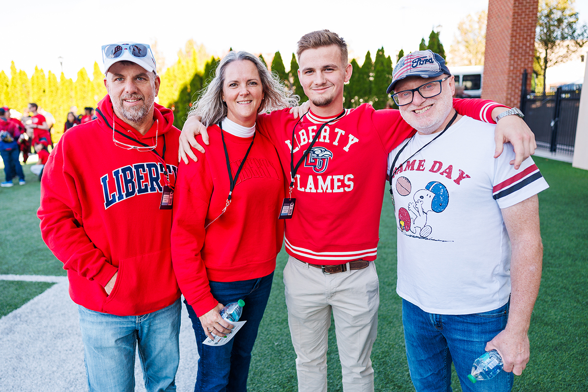In the hours leading up to the Flames Football game on Saturday afternoon, families had multiple opportunities to join in Homecoming festivities. The traditional Homecoming Parade down University Boulevard featured the Spirit of the Mountain Marching Band, various floats from different departments, and university leaders, including Liberty President Dondi E. Costin and his wife, Vickey, and Chancellor Jonathan Falwell and his wife, Shari, tossing candy to the crowd.