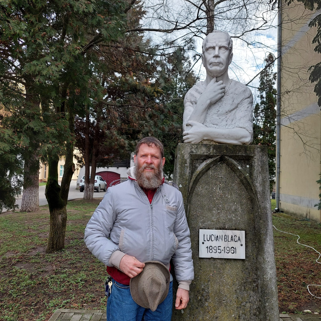Jones poses beside a statue of Lucian Blaga, who continued writing philosophical manuscripts after being blacklisted by the Romanian communists. Blaga’s works were later published after he died in 1961.
