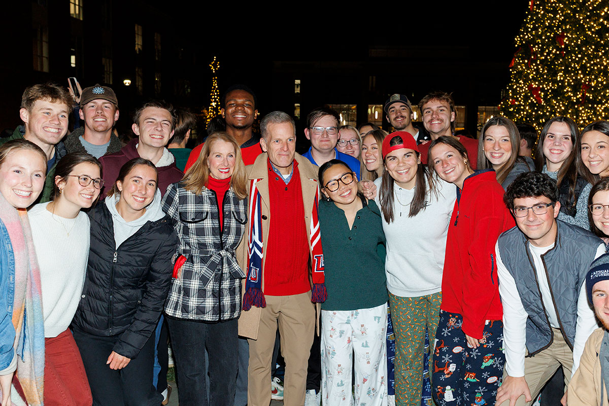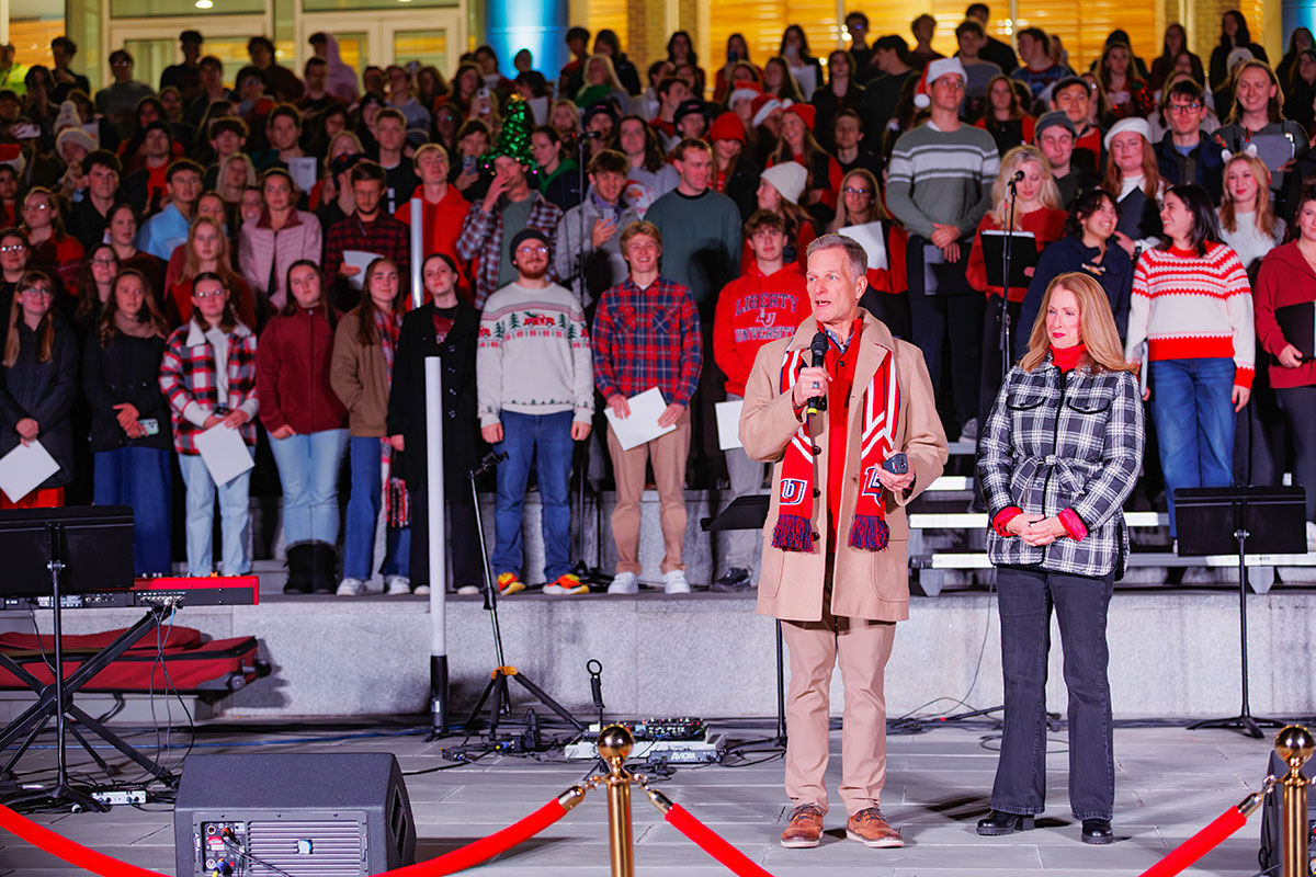 Later, Liberty President Dondi E. Costin and his wife, Vickey, stood on the Montview Student Union steps and led a10-second countdown before yelling “Light em’ up” and illuminating the tree in the center of the Academic Lawn.