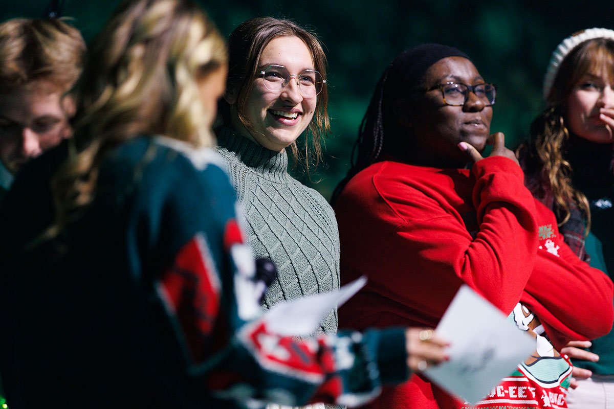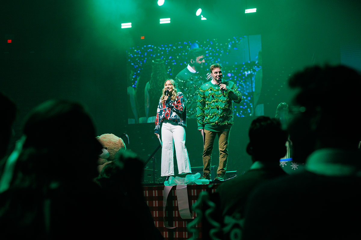 Two members of the Student Activities staff, Ty Justice and Sophia White, were the emcees of the night. Between performances, the pair led on-stage games where select students had to guess the ending of obscure Christmas Hallmark movies and figure out what movies different Santa clips were from. They poked fun at popular pop culture events, memes, and Liberty inside jokes.