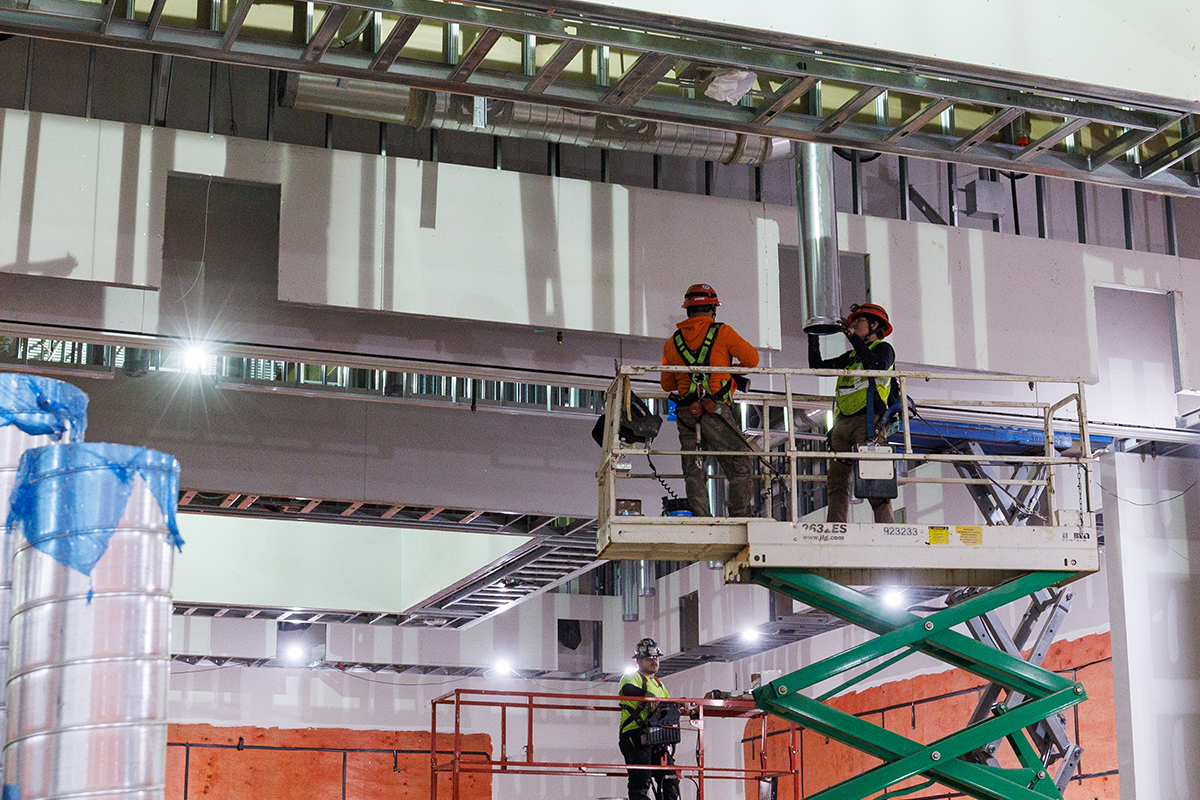 Moving into the interior, installation of drywall, ductwork, and electrical infrastructure is well underway, with the latter two nearing completion. Installation of a 93-foot-long curve projection screen is in progress.