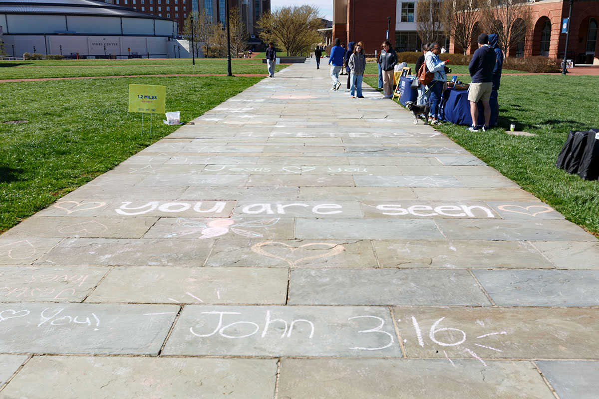 Around 90 people participated in the walk, with many sporting blue T-shirts with the AFSP motto, “Hope Walks Here.” The 1.3-mile walk started on the Academic Lawn, continued to the bookstore, then wrapped around Campus East and through the pedestrian tunnel connecting participants back to main campus. The sidewalks were lined with chalk illustrations, verses, and inspirational quotes.