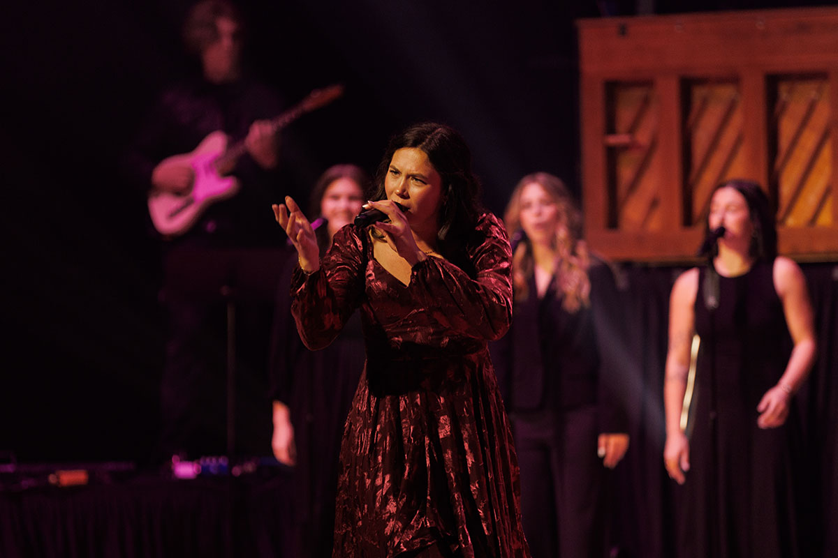 Emma Jordan Gutierrez, a graduate student studying music and worship with a focus on commercial music performance, opened the night with a powerful and energetic cover of “Born Again” by Bill Gaither.