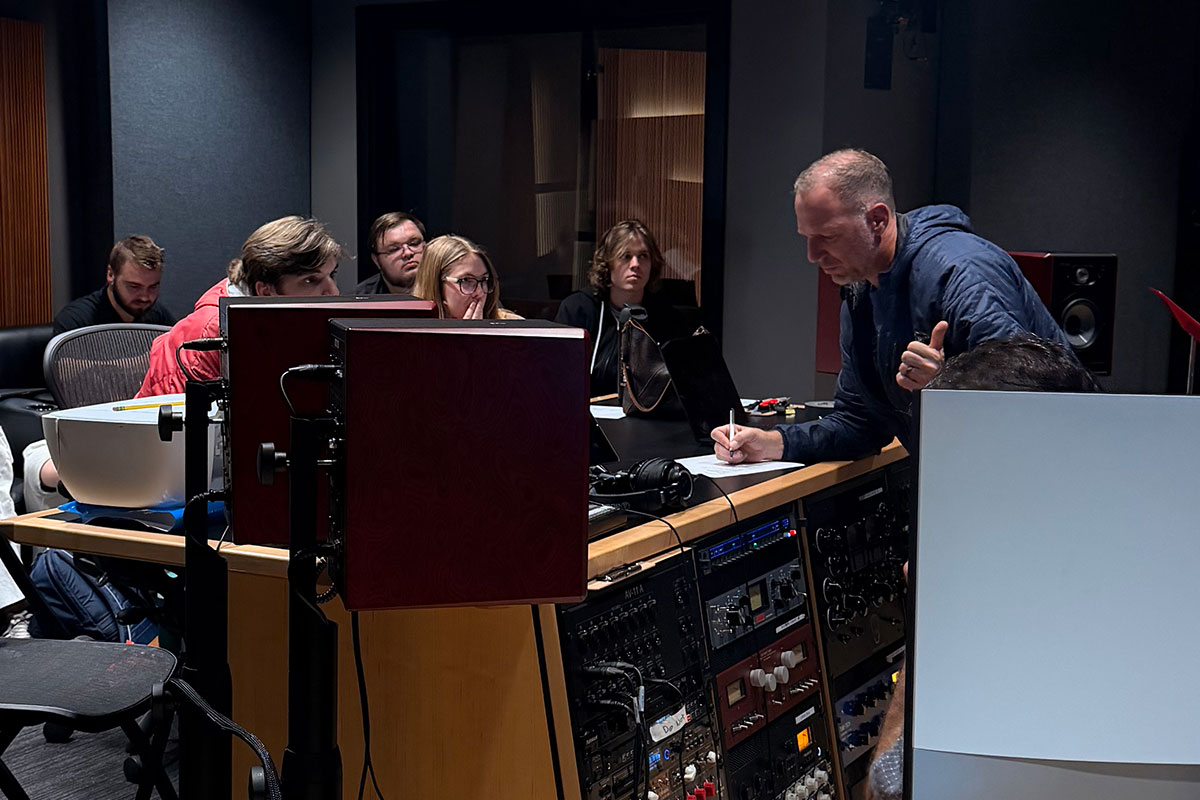 Hall shared insights from his extensive career as an award-winning studio vocalist and artist during a class with Associate Professor of Music Recording & Production Nathan Zwald. He focused on vocal performance, studio workflow, and capturing emotionally compelling recordings.