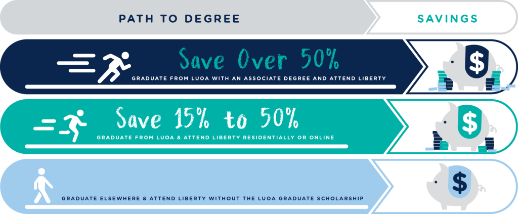 Liberty University is excited to offer an unparalleled scholarship opportunity exclusively for graduates from Liberty University Online Academy (LUOA). We are offering a 50% residential tuition scholarship or a 15% discount on online courses. For LUOA graduates who attend Liberty University directly following their LUOA graduation, you will be automatically eligible for our residential 50% tuition scholarship or our 15% off online programs.
