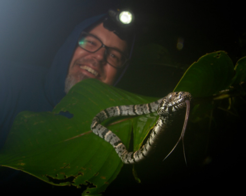Faculty member Dr. Kyle Harris on a Liberty-sponsored expedition looking for new snake species. The reptile pictured is a recently described new species of snail-eating snake from Panama.